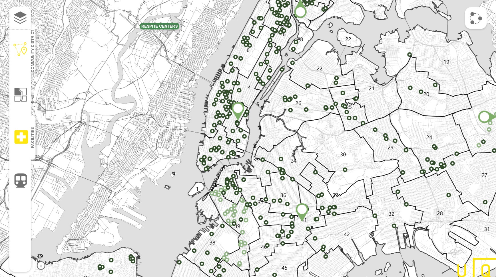 The interactive map allows the users to work in different scales, zooming in to study individual facility programs, or out to examine citywide patterns. Through a macro scale, users can toggle between layers to reveal where different organizations are located along with their community districts, their access to transportation, land use, and zoning conditions. In a micro scale, program diagrams illustrate the percentage of community spaces within each center as well as the different allocations of space. Together, they help to guide future land use decisions for the design and placement of facilities.