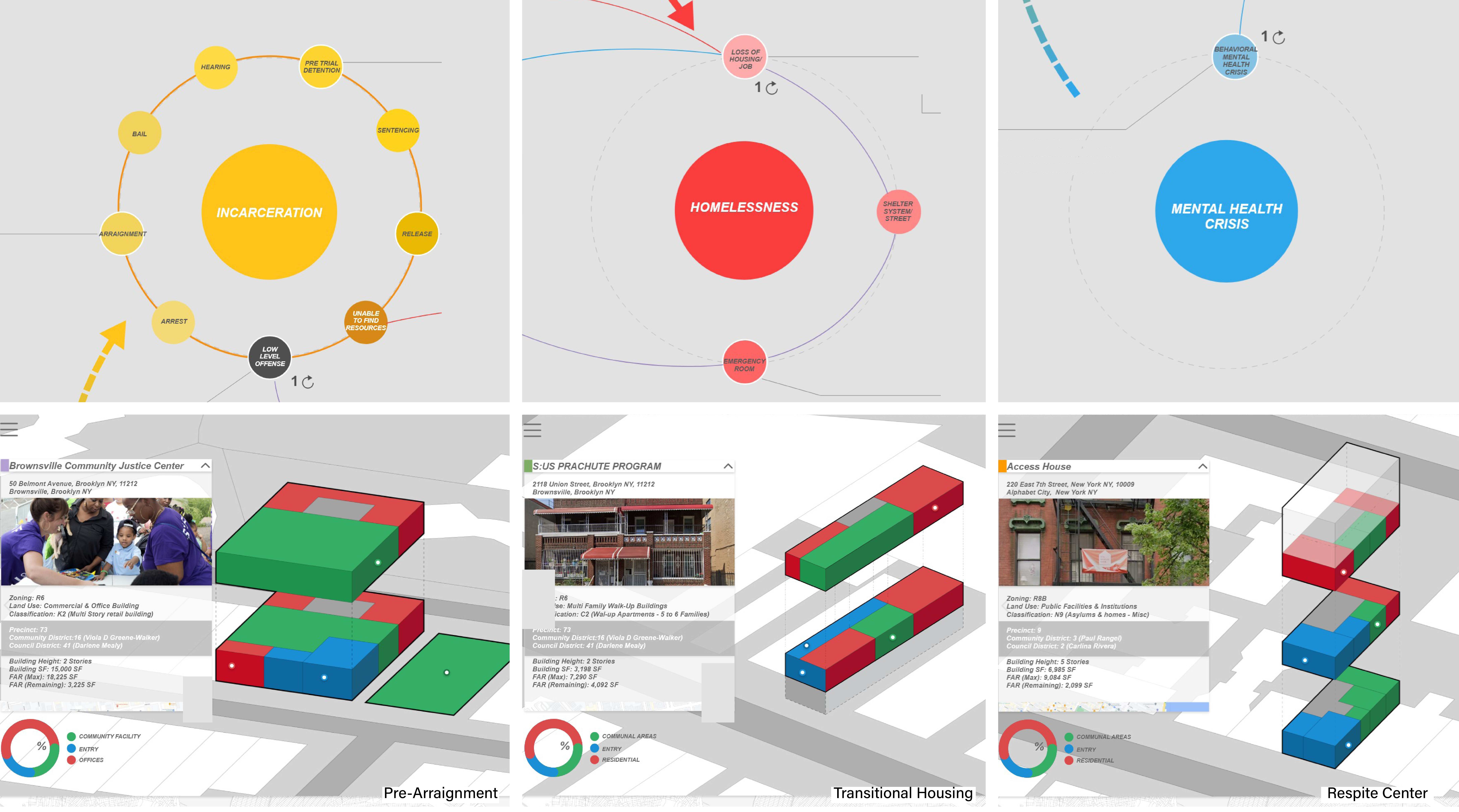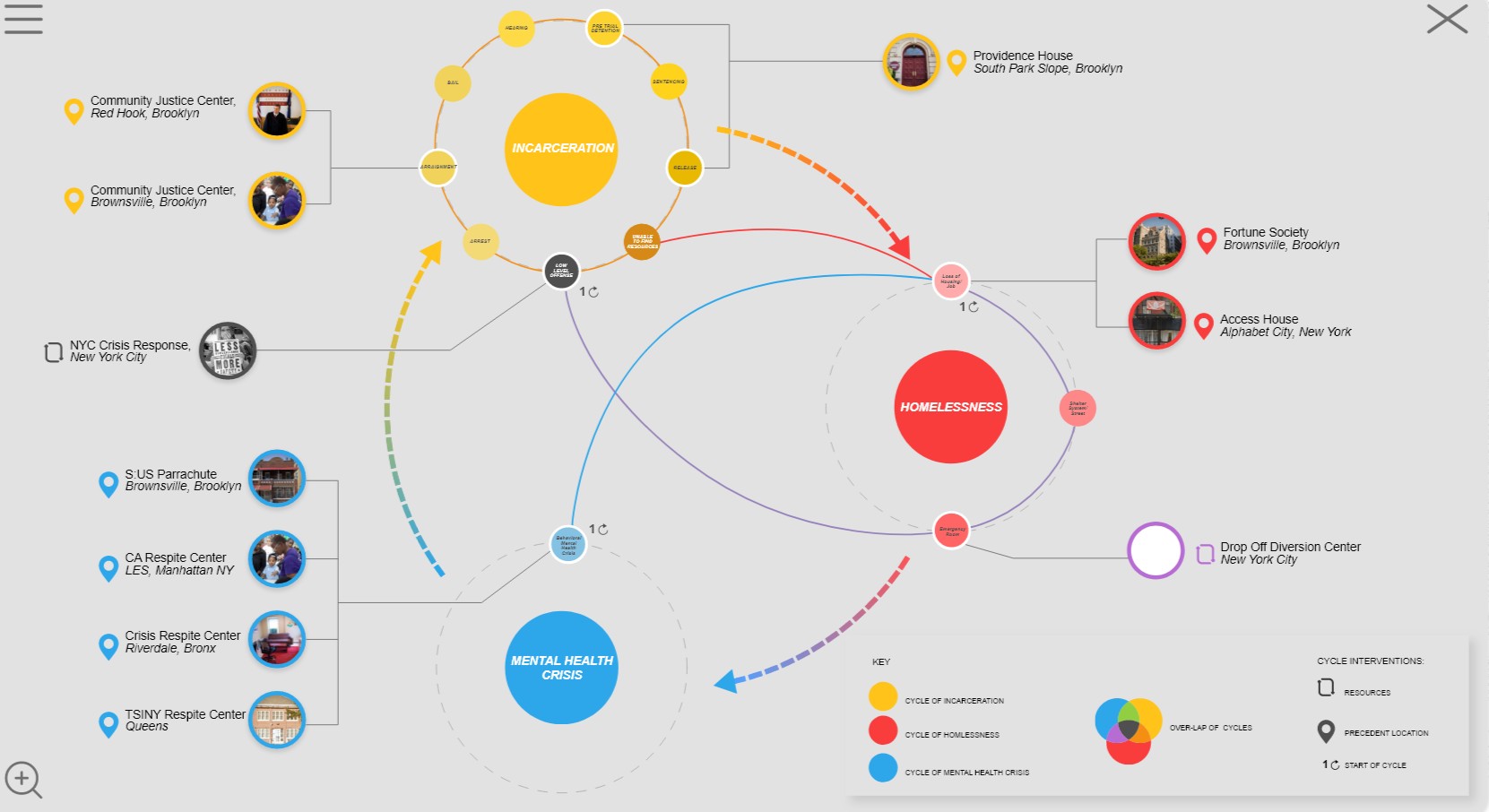 In 2017, New York State announced that Rikers Island would close and be replaced by a new, smaller jail system comprised of 4 new facilities in the boroughs. Each of these new developments would include community facilities and programming, yet many of these services were left vague and unidentified. The lack of clarity led to our exploration of which programs would best be suited to help create a more humane jail system. The vast amount of existing research and studies revealed that the incarceration cycle cannot be addressed in isolation as it exists in a continuum between homelessness and mental health crises. These three systems are interconnected, yet despite the numerous organizations that exist throughout New York City addressing these issues, there is no central resource to catalog these efforts or visual representations that illustrate how they overlap and influence one another on a larger scale.