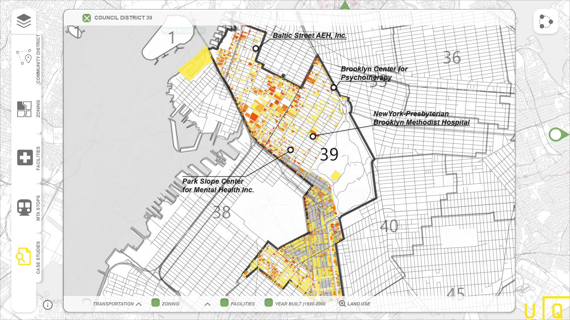 UQ has identified the location of existing facilities across the city ranging from crisis response centers, pre-arraignment centers, transitional housing, and DOH shelters. This catalog of existing precedent models provides information of neighborhood characteristics that can be indicative of where new facilities are needed and might thrive.